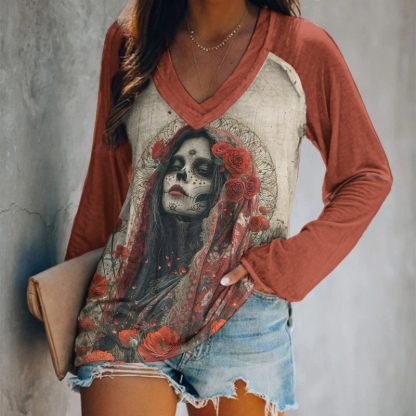 Vintage Day Of The Dead Skull Floral Art T-Shirt