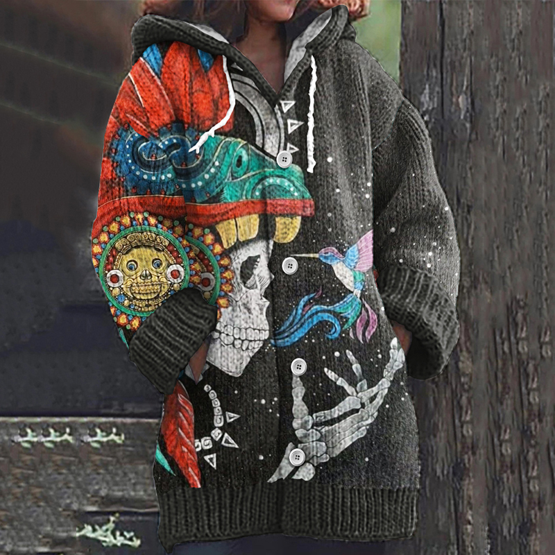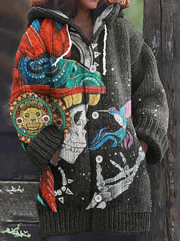 Vintage Day Of The Dead Skull Hummingbird Art Knit Cardigan Sweater