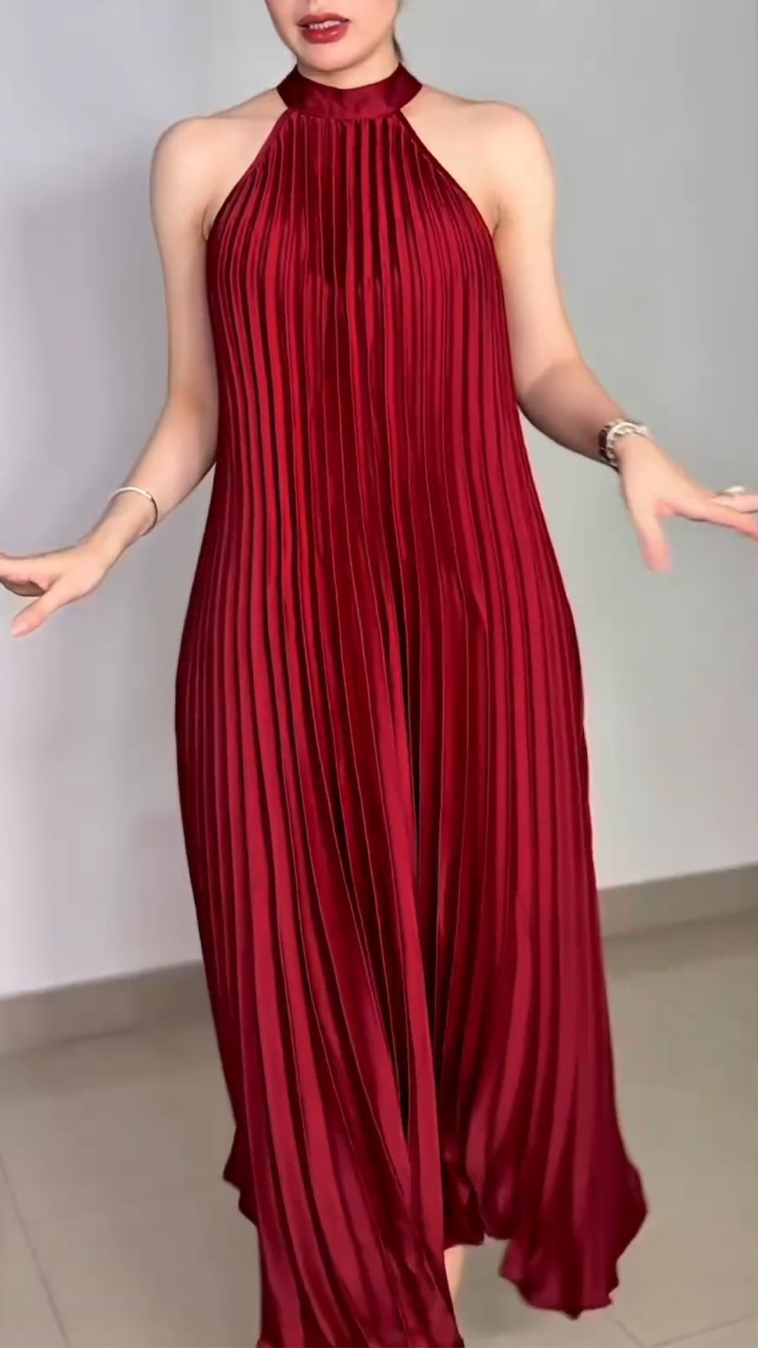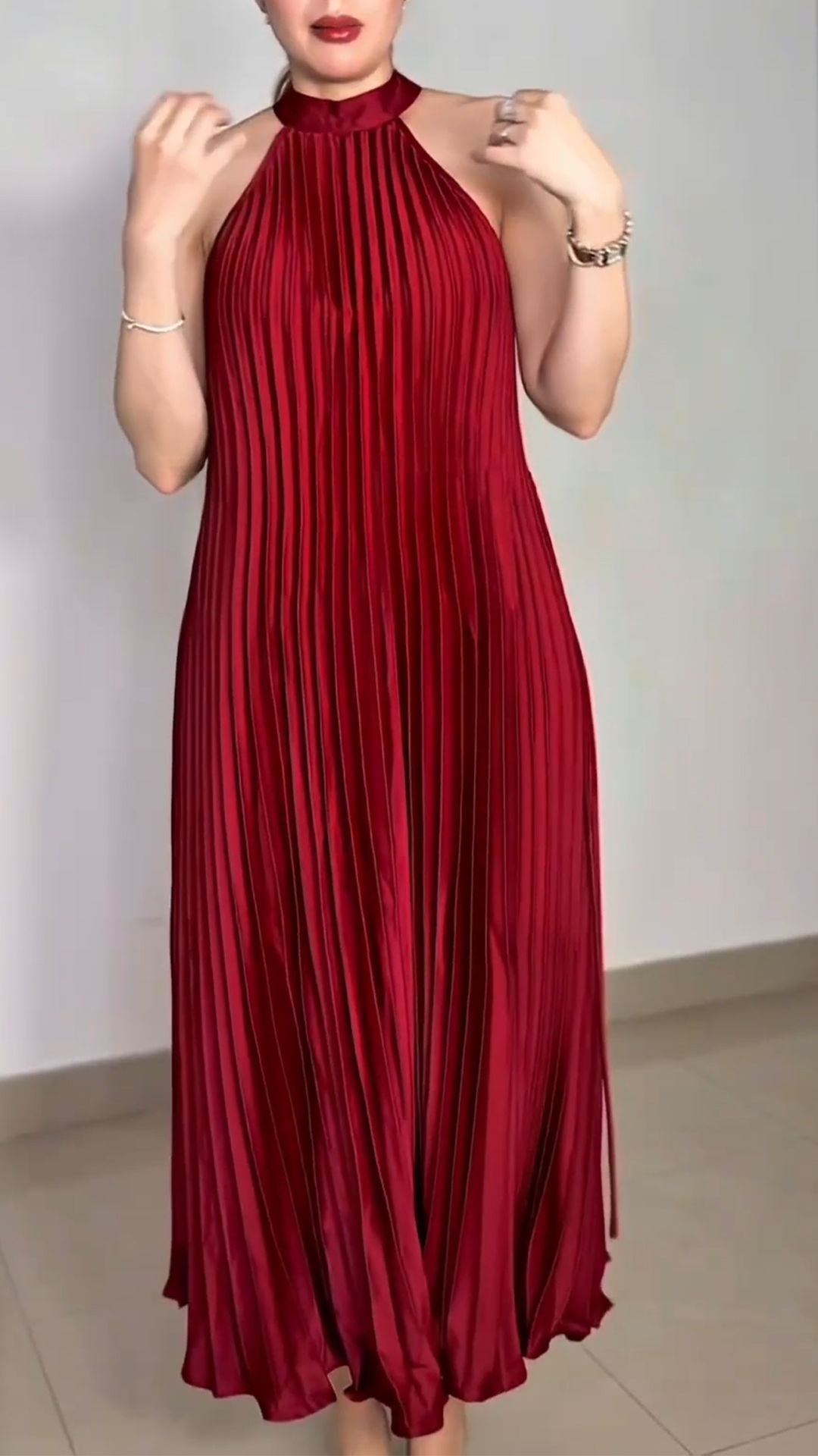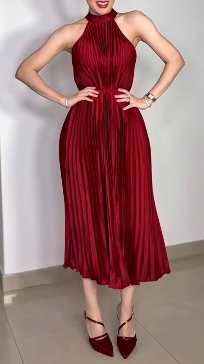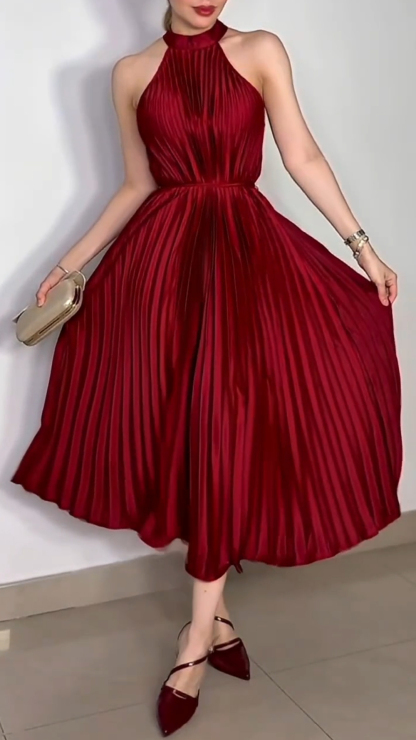 This stunning red maxi dress features a pleated design that adds texture and movement. The sleeveless halter neckline offers a chic and modern look, perfect for a wedding guest or cocktail event. Its elegant silhouette and vibrant color make it a standout choice for any special occasion.This stunning red maxi dress features delicate pleating that adds texture and movement. The sleeveless design with a chic halter neckline creates a modern, sophisticated look, perfect for wedding guests or cocktail parties. Its elegant silhouette and vibrant color make it a showstopping choice for any special occasion. The flowing fabric drapes beautifully, enhancing your natural curves while maintaining effortless grace. Designed to turn heads, this statement piece combines timeless elegance with contemporary flair. Whether you're attending a formal event or an evening soirée, this dress ensures you'll stand out in the crowd. The bold crimson hue radiates confidence and passion, making it ideal for those who want to make a lasting impression. Lightweight yet structured, it offers both comfort and style for hours of wear. Pair it with strappy heels and delicate jewelry for a complete, polished ensemble. This versatile dress transitions seamlessly from summer garden parties to winter holiday celebrations. Its flattering cut suits various body types, creating a universally beautiful look. The high-quality fabric ensures durability while maintaining a luxurious feel against the skin. A must-have in any fashion-forward wardrobe, this dress embodies femininity and power in equal measure.