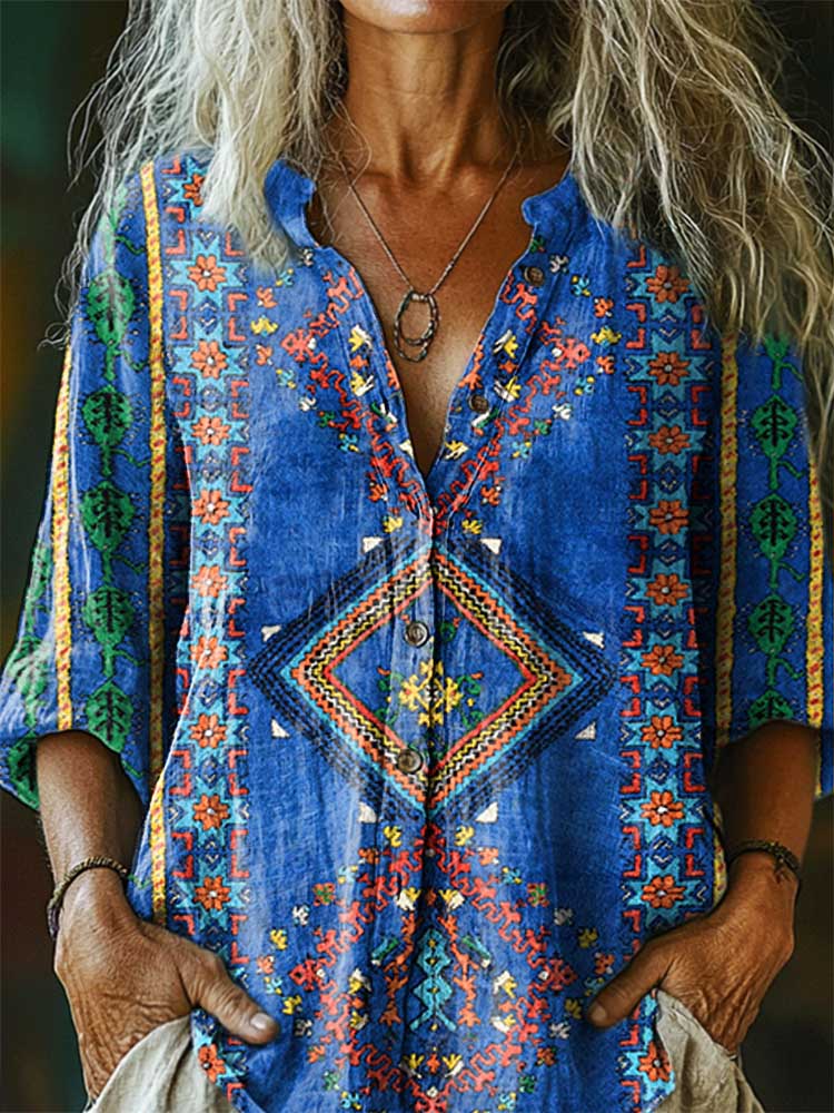 Women's Ethnic Style Pattern Art Printed Cotton and Linen Casual Shirt