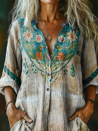 Women's Floral Pattern Art Print Casual Cotton Linen Shirt