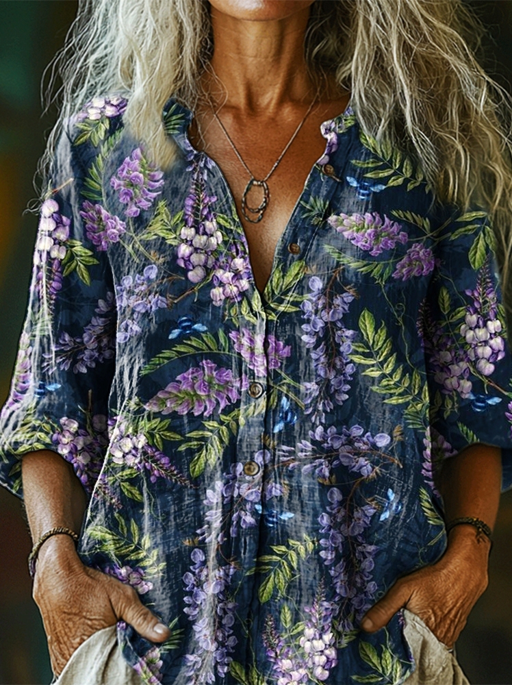 Women's Flowers Art Print Casual Cotton And Linen Shirt