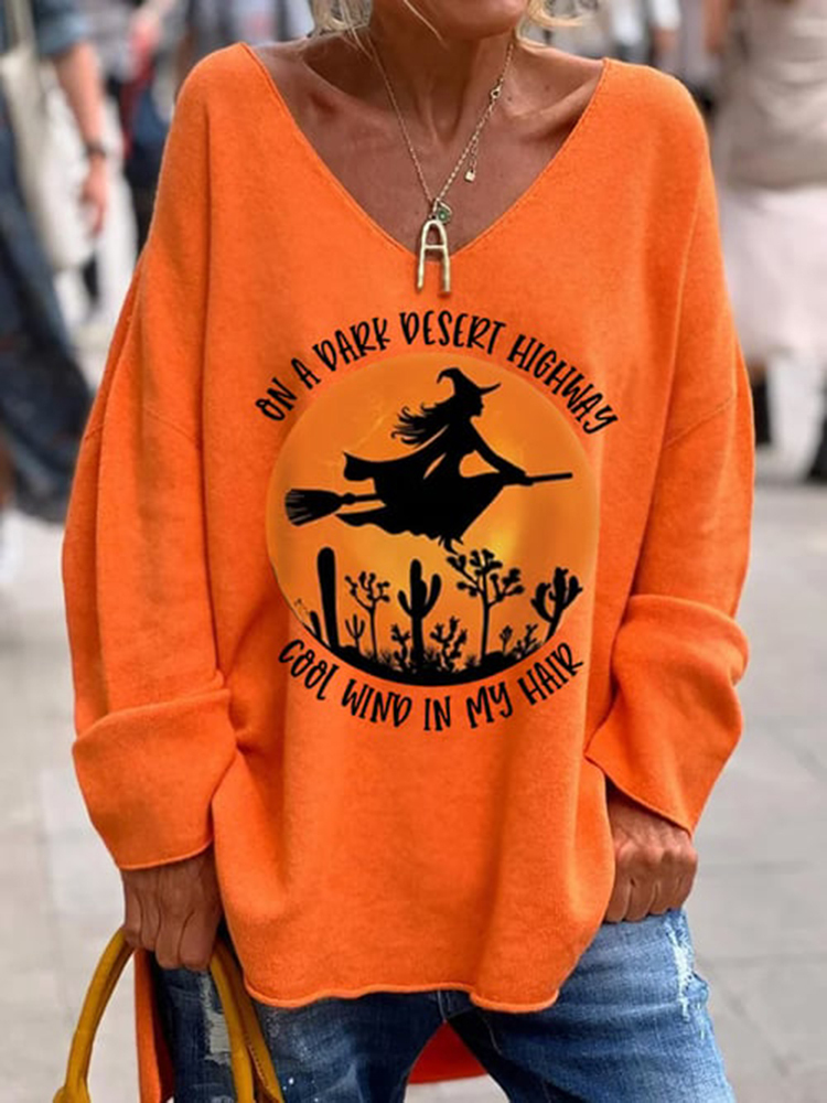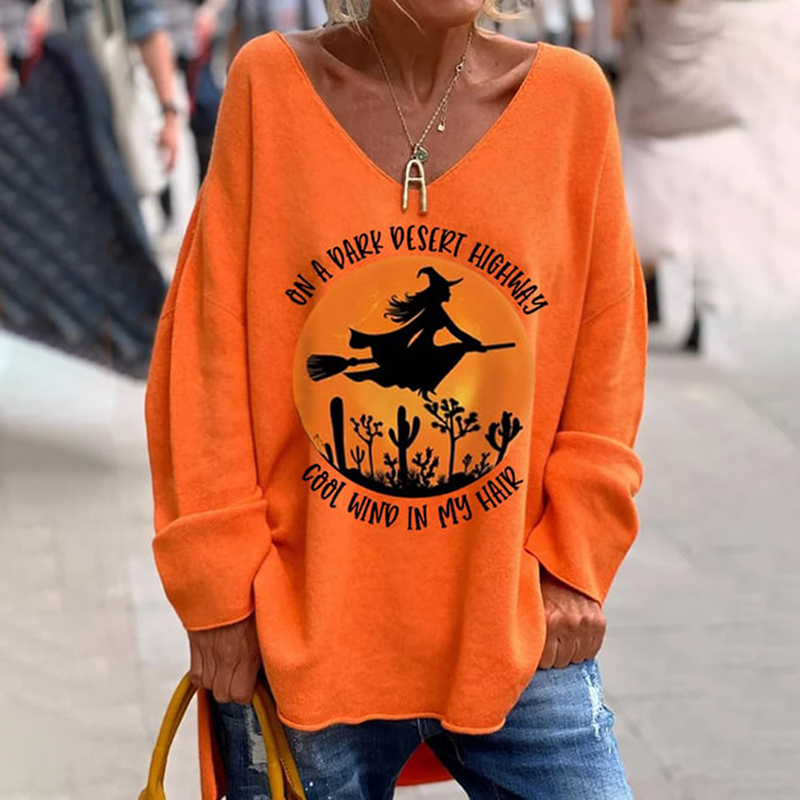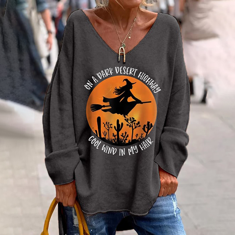 Women's Funny Halloween On A Dark Desert Highway Cool Wind In My Hair Casual V-Neck Long-Sleeve Top