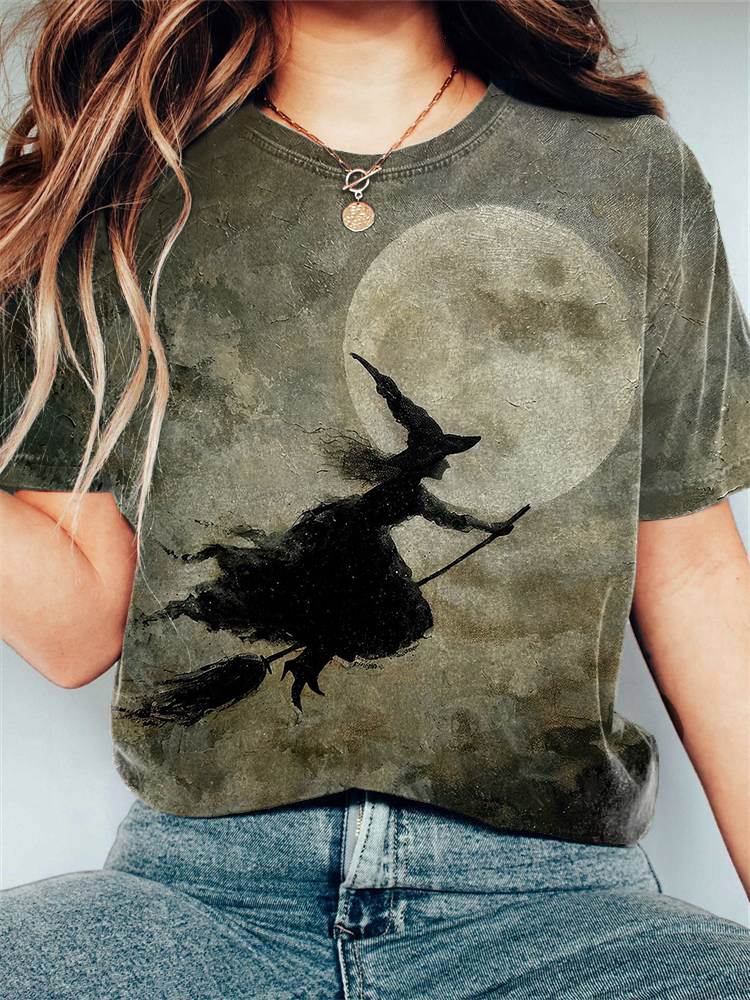 Women's Halloween Witch Art Print Vintage T-Shirt