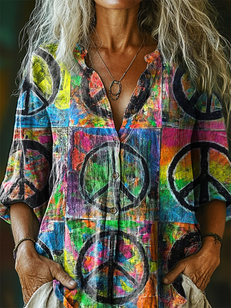 Women's Hippie Art Print Casual Cotton And Linen Shirt