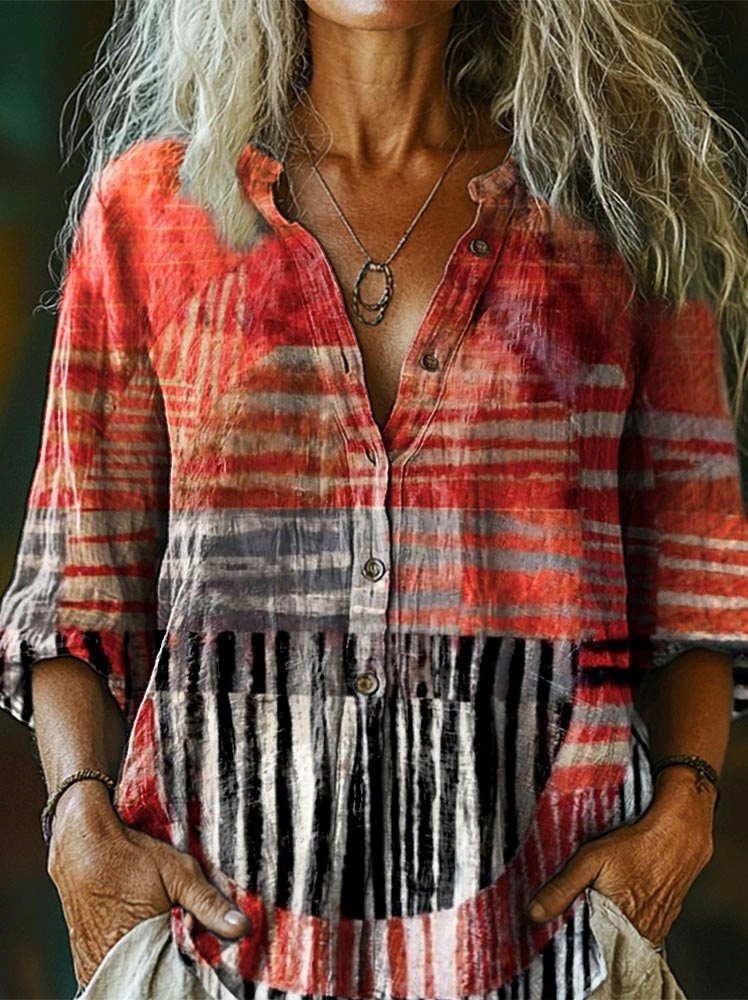 Women's Lines Geometric Art Pattern Print Casual Cotton And Linen Shirt
