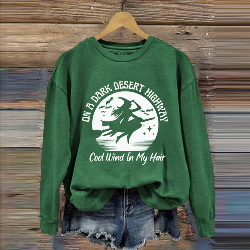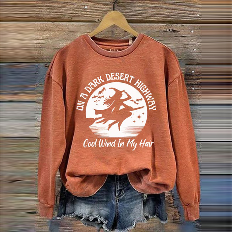 Women's On A Dark Desert Highway Cool Wind In My Hair Halloween Witch Print Crew Neck Sweatshirt