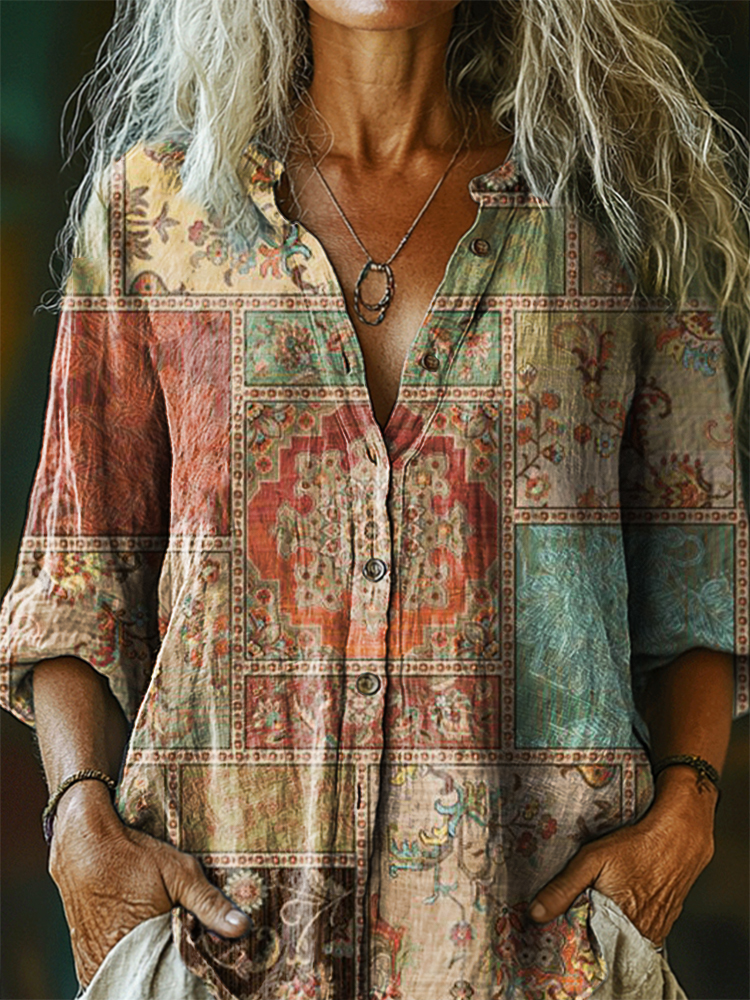 Women's Retro Ethnic Floral Art Print Casual Cotton And Linen Shirt