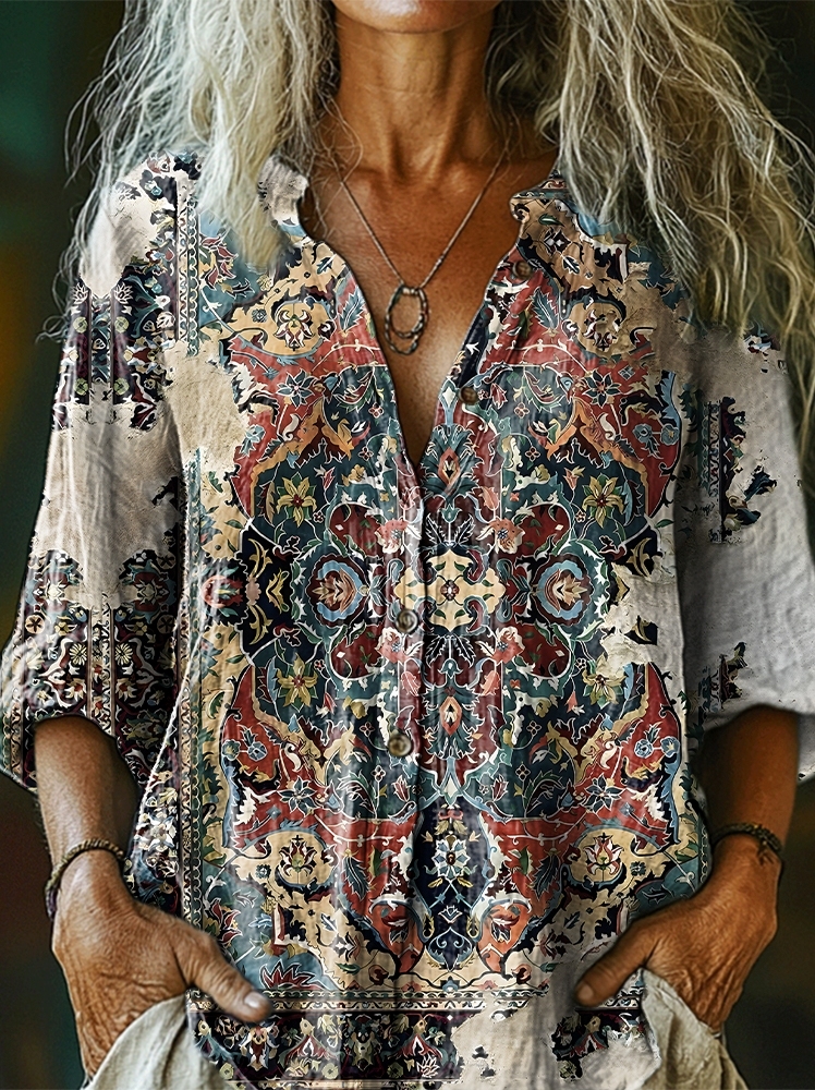 Women's Retro Ethnic Totem Art Print Casual Cotton And Linen Shirt
