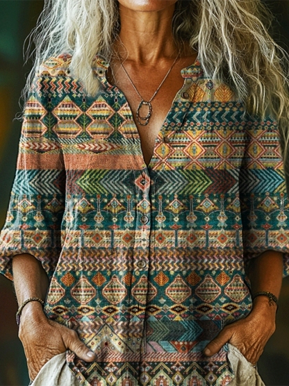 Women's Retro Ethnic Totem Art Print Casual Cotton Linen Shirt