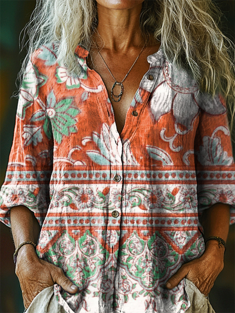 Women's Vintage Ethnic Floral Art Print Casual Cotton And Linen Shirt