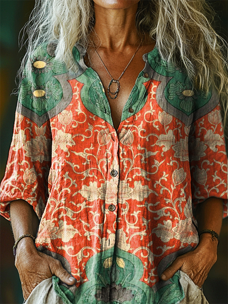 Women's Vintage Ethnic Floral Art Print Casual Cotton And Linen Shirt