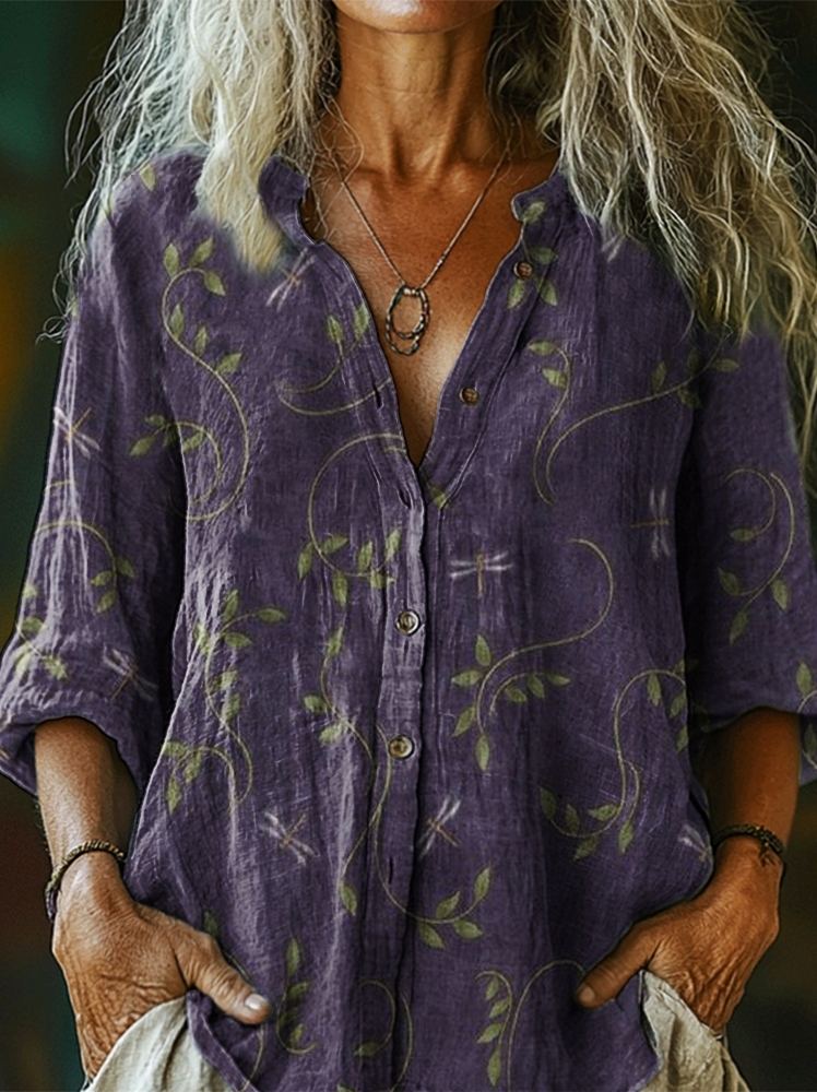 Women's Vintage Floral Art Pattern Print Casual Cotton Linen Shirt
