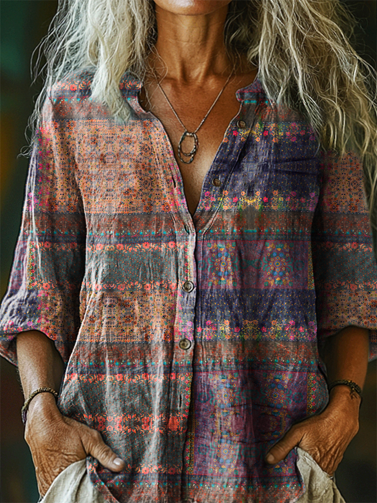 Women's Vintage Floral Art Print Casual Cotton And Linen Shirt