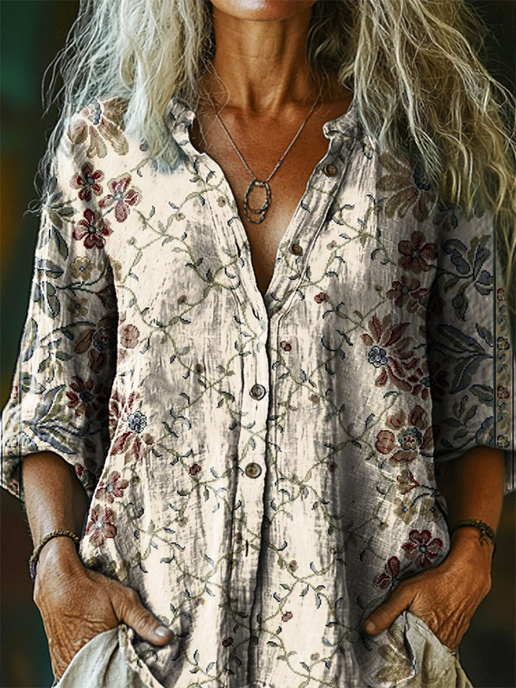 Women's Vintage Floral Art Print Casual Cotton Linen Shirt