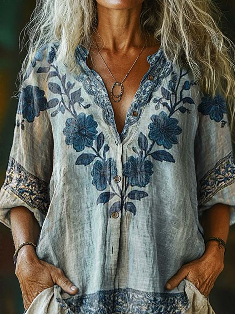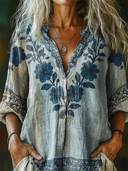 Women's Vintage Floral Pattern Art Print Casual Cotton Linen Shirt
