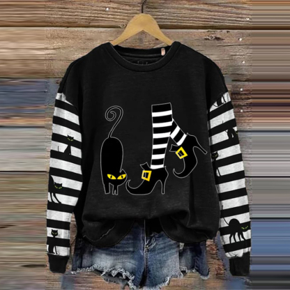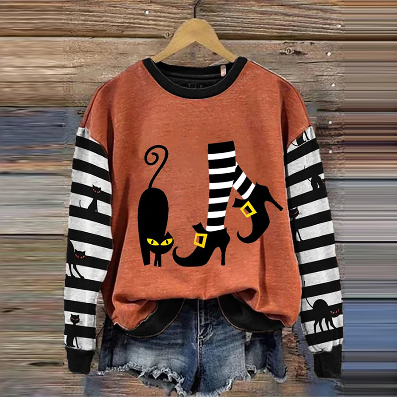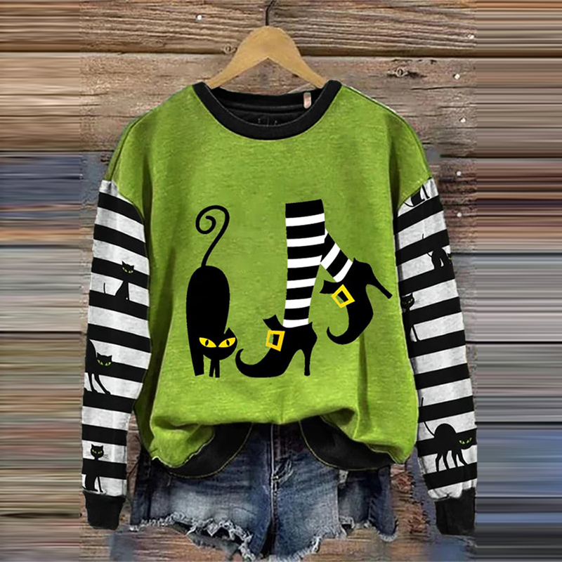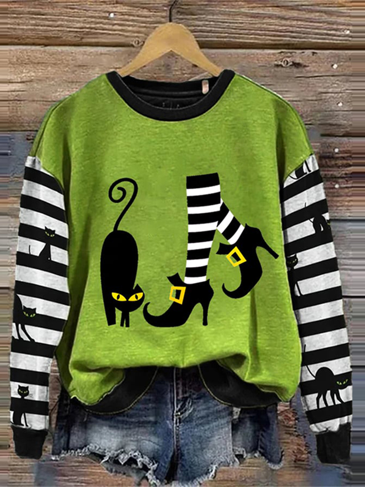 Women's Witch And Cat Print Crew Neck Sweatshirt