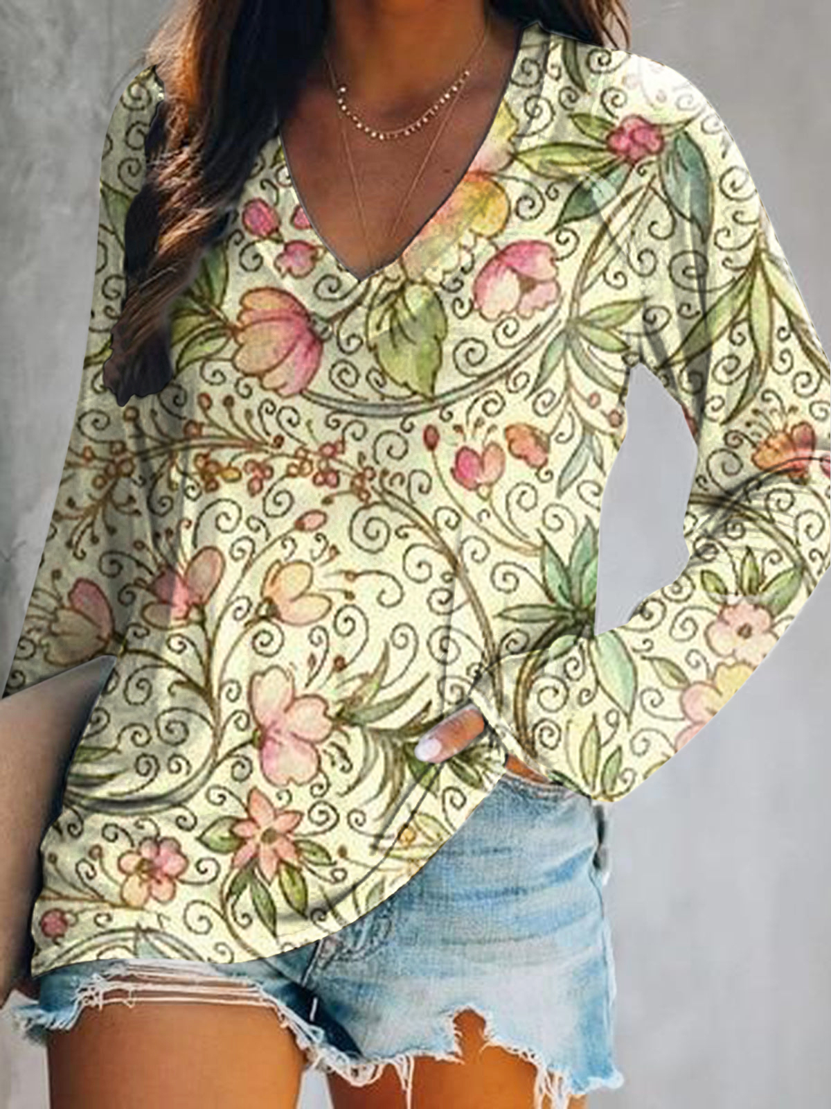 Women's Casual Vintage Floral Art Print V Neck Long Sleeve Tops