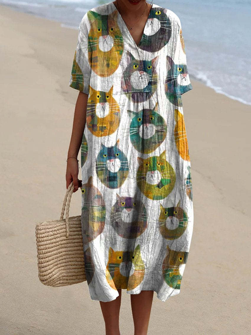 Women's Cat Watercolor Contrasting Color Geometry Art Print Flowy Dress