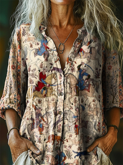 Women's Vintage Ethnic Floral Art Print Casual Cotton Linen Shirt
