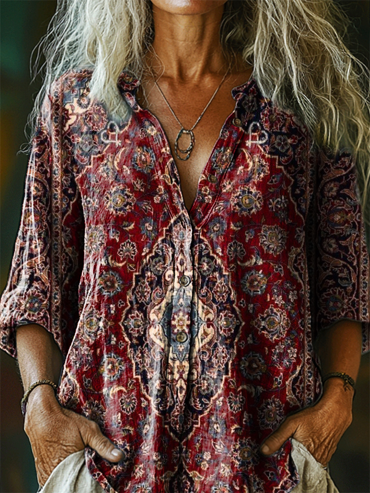 Women's Vintage Ethnic Floral Art Print Casual Cotton Linen Shirt