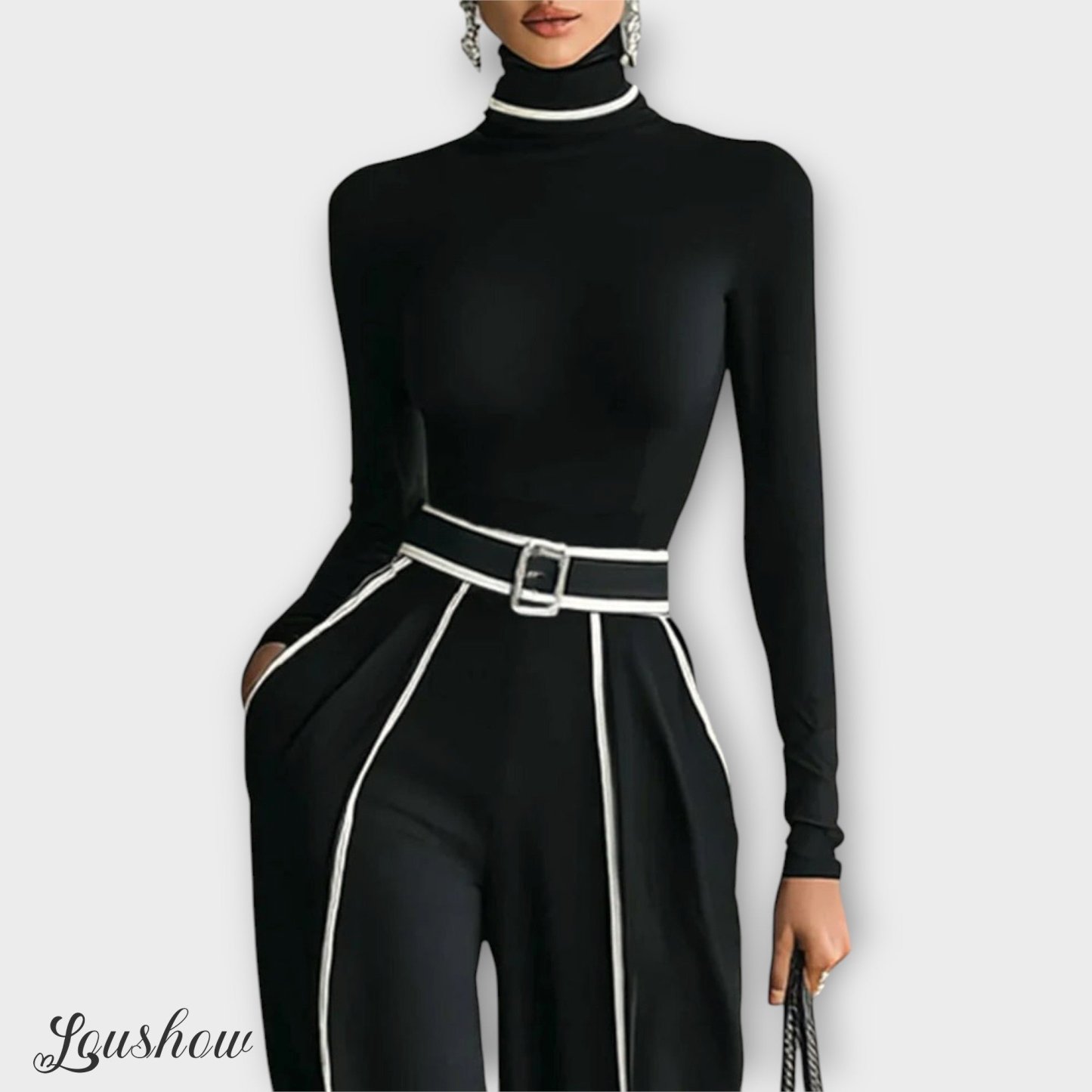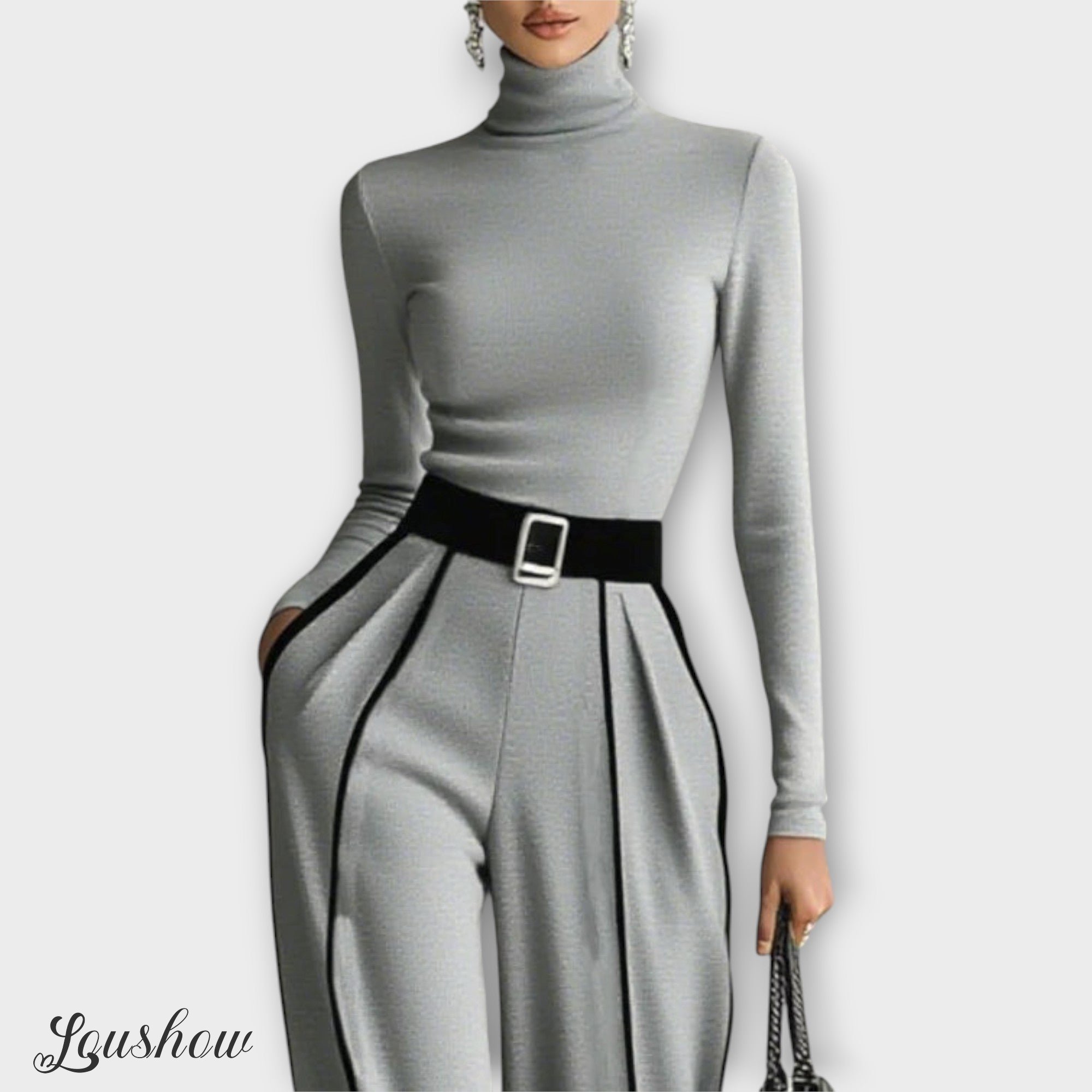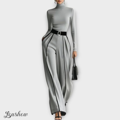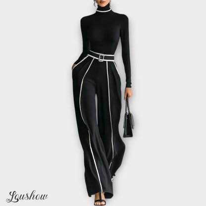 A refined two-piece set designed to bring elegance and modern style to any wardrobe. Featuring a long-sleeve turtleneck top with contrast trimming and wide-leg pants, this set combines comfort with chic sophistication. The matching belt highlights the waist, adding structure and enhancing the silhouette. Perfect for both casual outings and more formal occasions, it’s a versatile choice that exudes timeless charm.