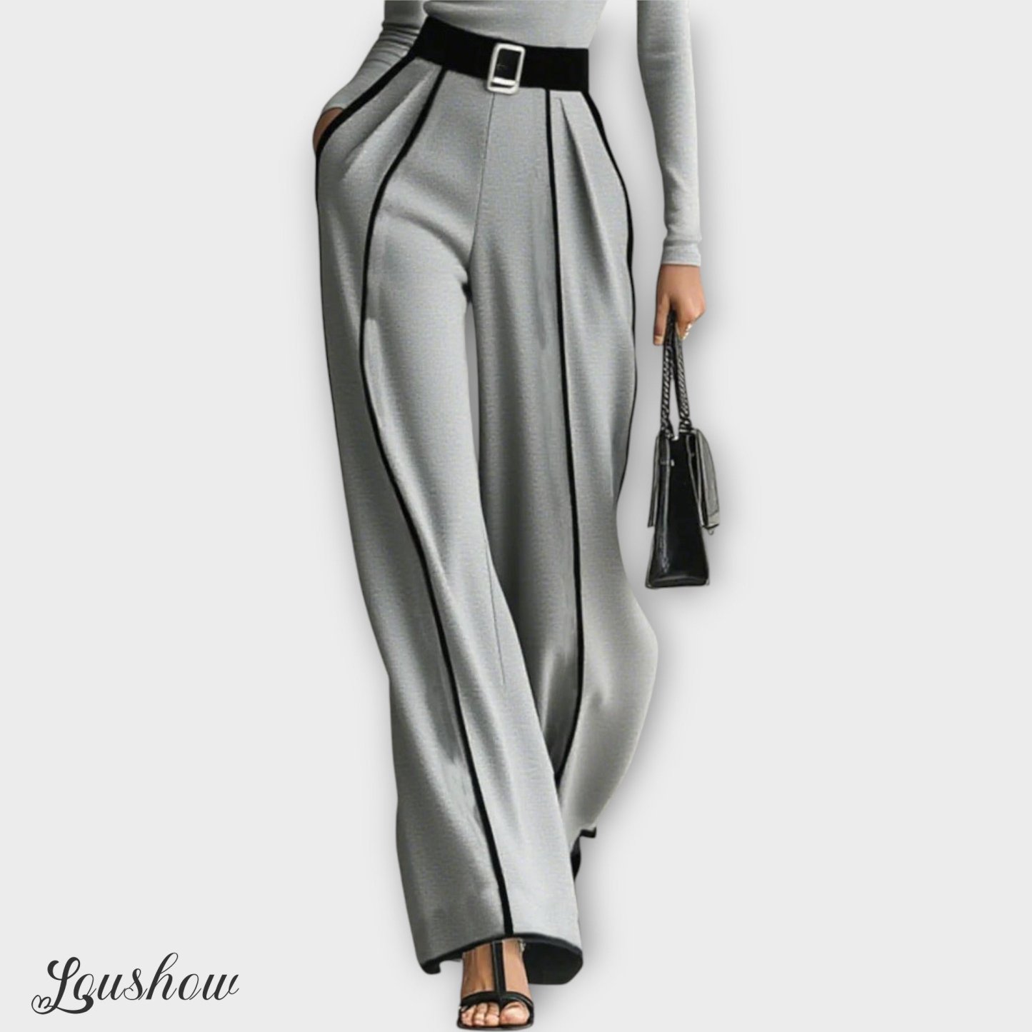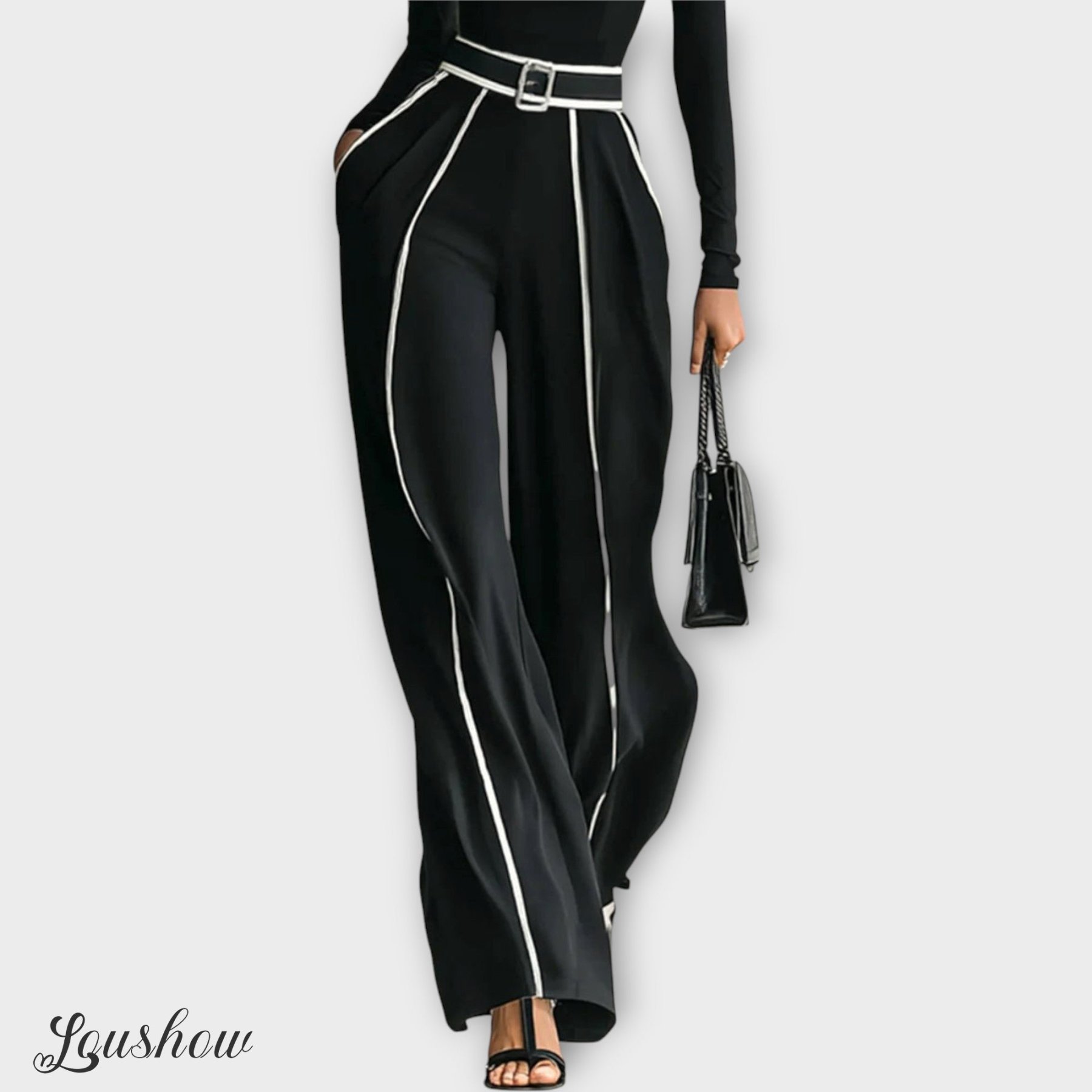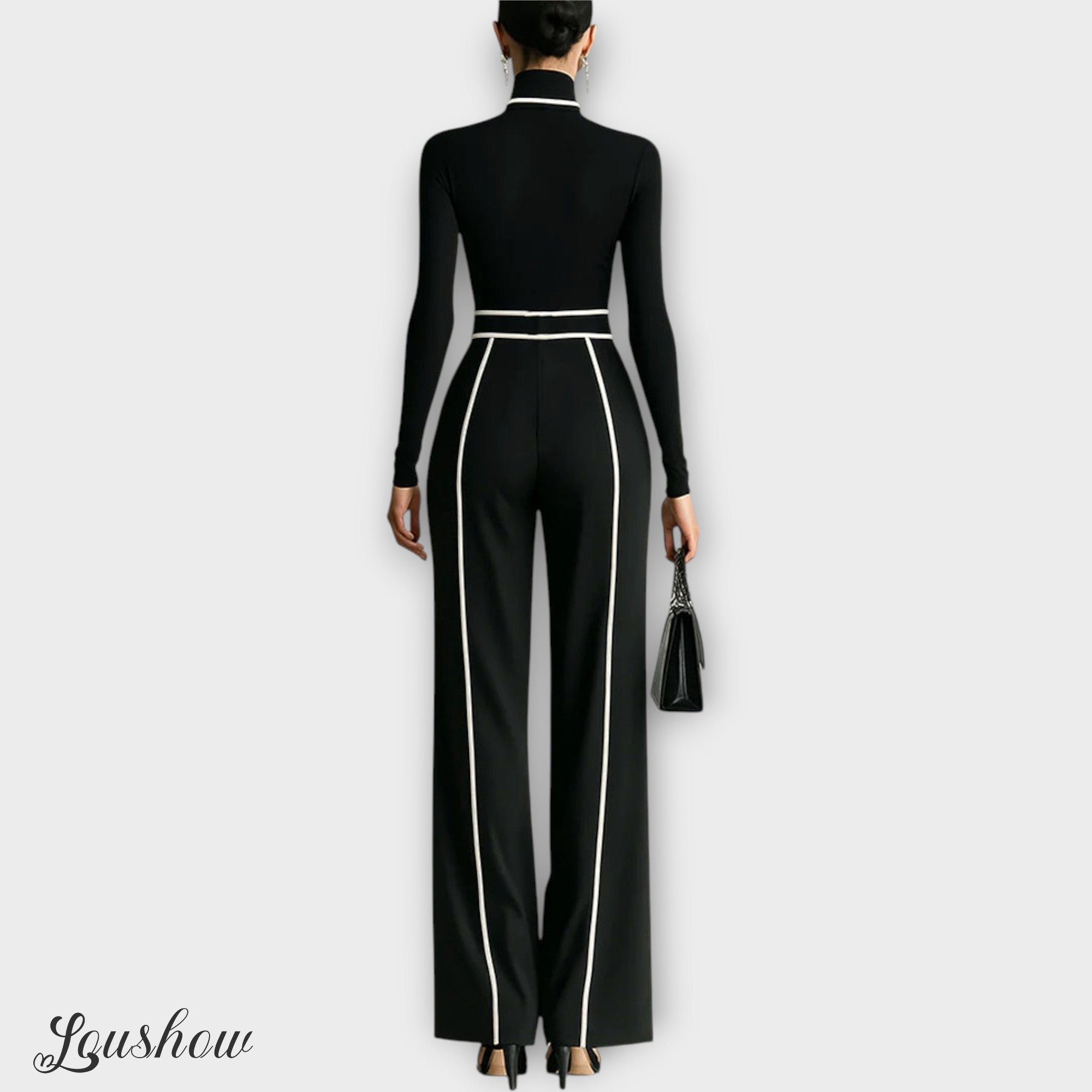 A refined two-piece set designed to bring elegance and modern style to any wardrobe. Featuring a long-sleeve turtleneck top with contrast trimming and wide-leg pants, this set combines comfort with chic sophistication. The matching belt highlights the waist, adding structure and enhancing the silhouette. Perfect for both casual outings and more formal occasions, it’s a versatile choice that exudes timeless charm.