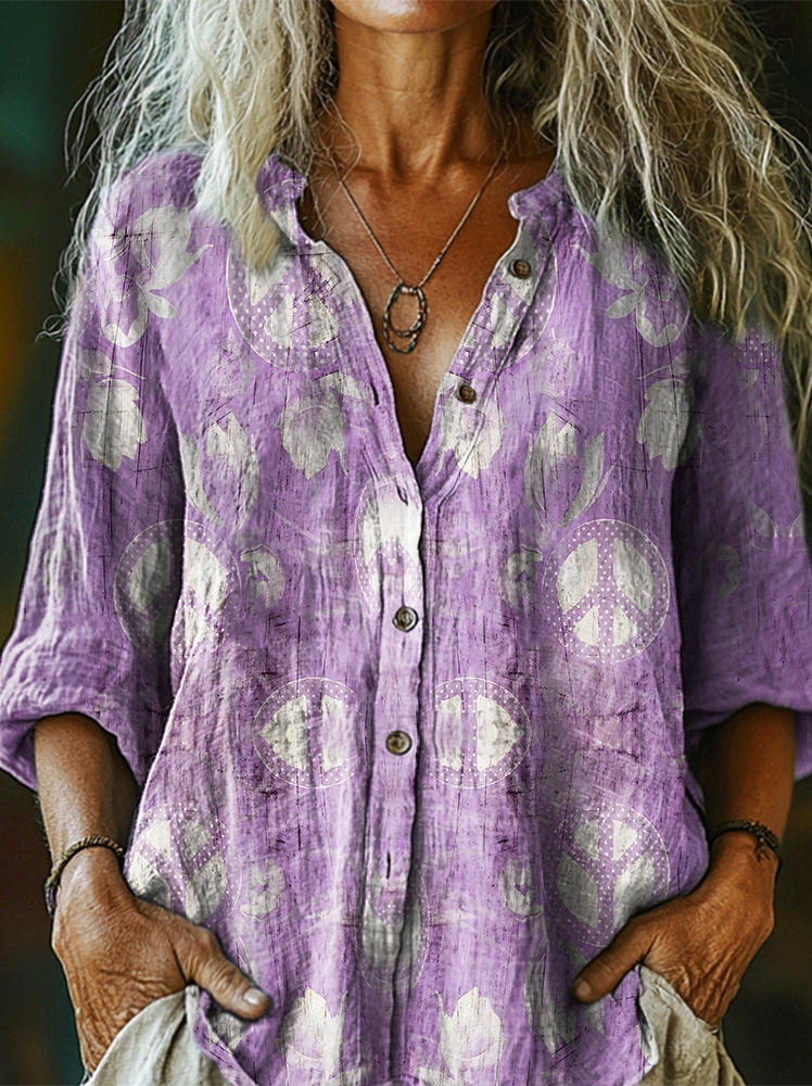 Women's Hippie Peace Flower Art Print Linen And Cotton V-neck Casual Shirt