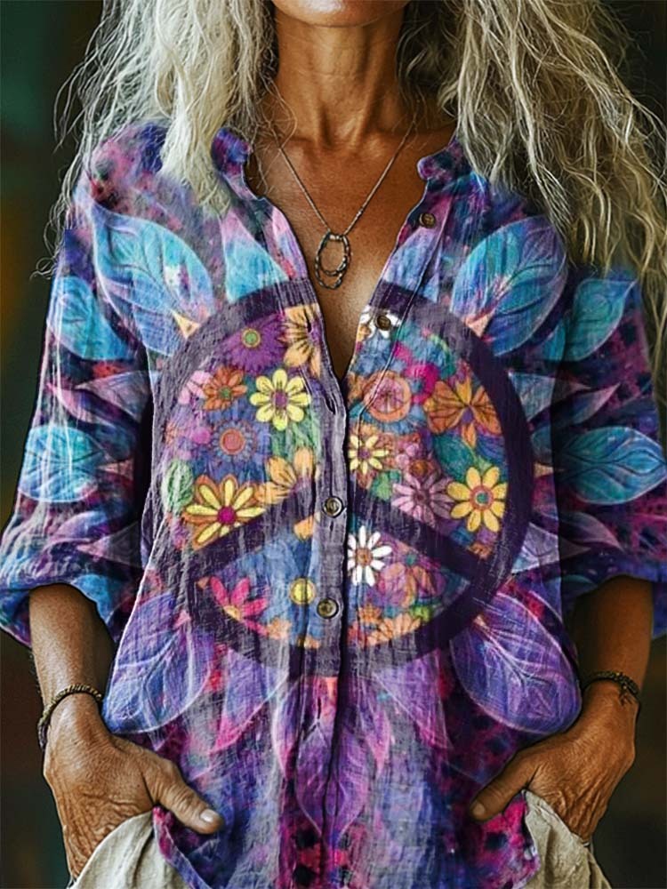 Women's Hippy Pattern Art Print Linen Cotton V-Neck Casual Shirt