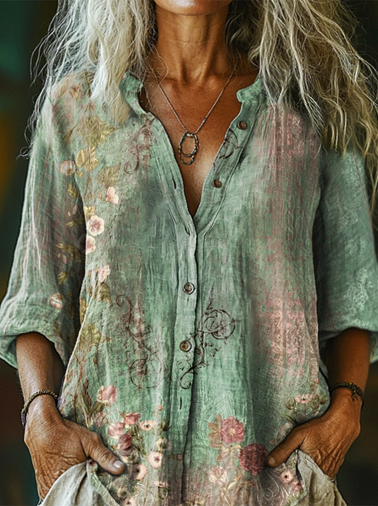 Women's Vintage Ethnic Floral Art Print Linen And Cotton V-neck Casual Shirt