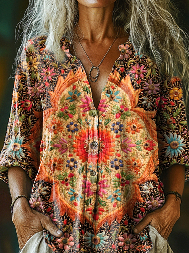 Women's Vintage Ethnic Floral Art Print Linen And Cotton V-neck Casual Shirt