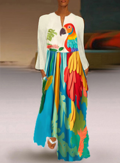 Casual Cute Parrot Print V-neck Long-sleeved Dress