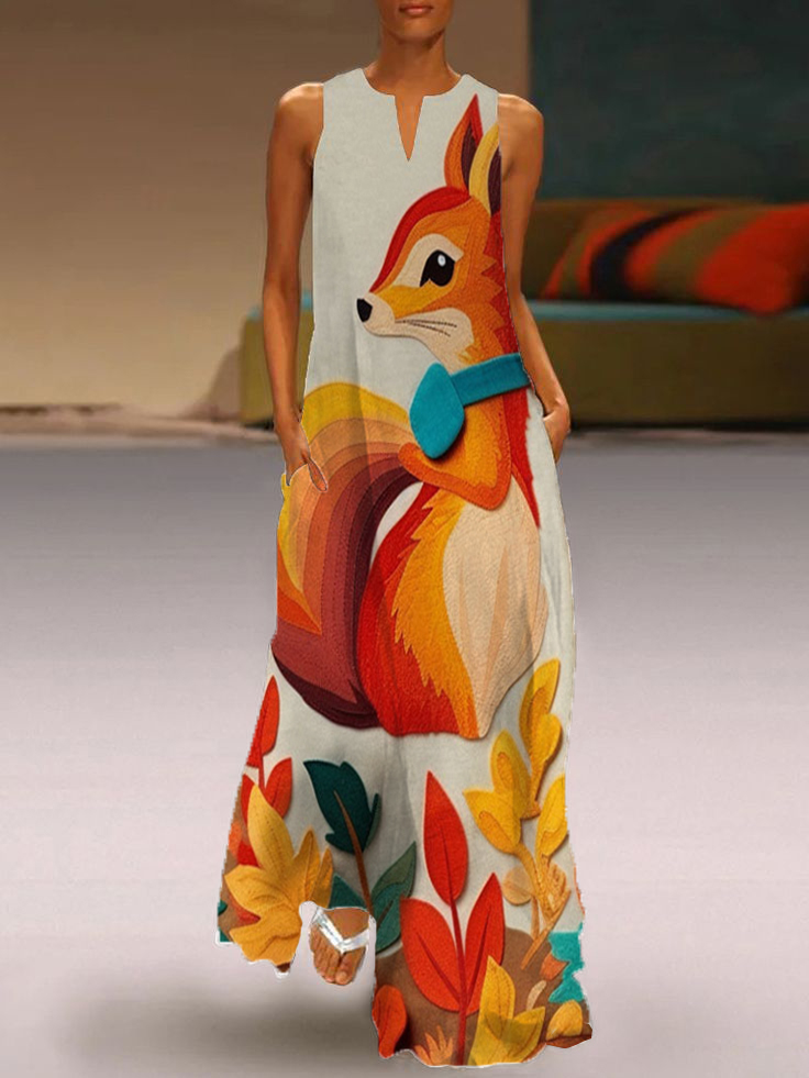 Casual Cute Squirrel Print V-Neck Sleeveless Dress