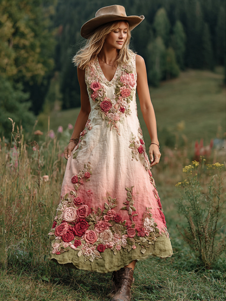 Love & Health Collection Retro Western Women Style Vintage Rose And Floral Patchwork Art V Neck Linen Maxi Dress