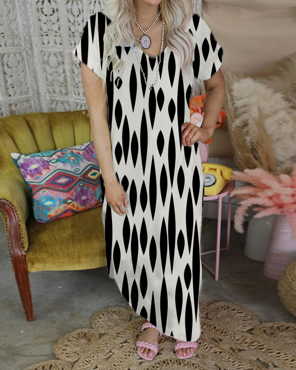 Print V-neck Short Sleeve Casual Loose Dress
