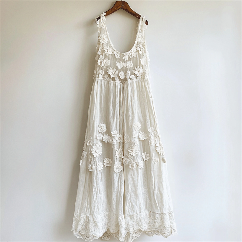 Vintage Floral Hollow Lace Patchwork Linen Tank Dress
