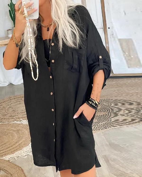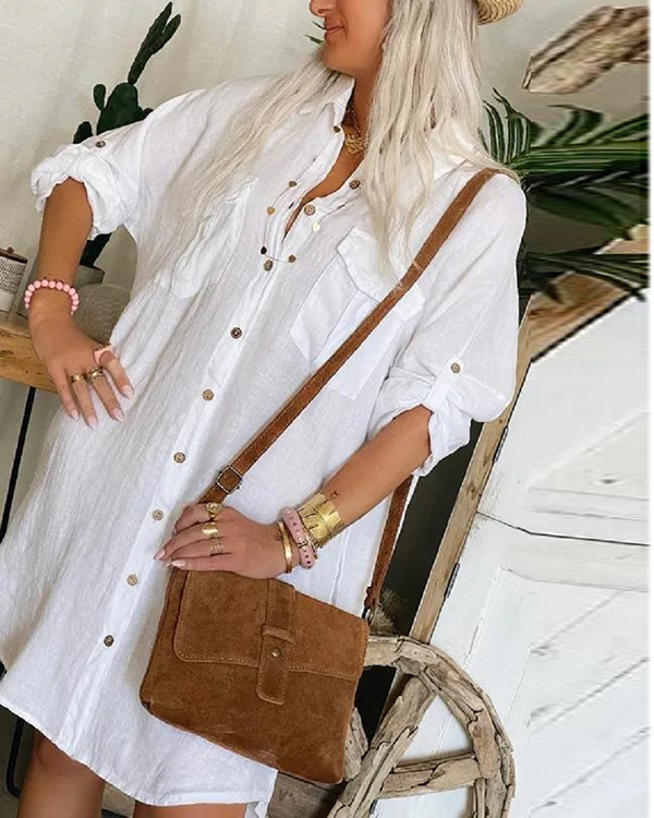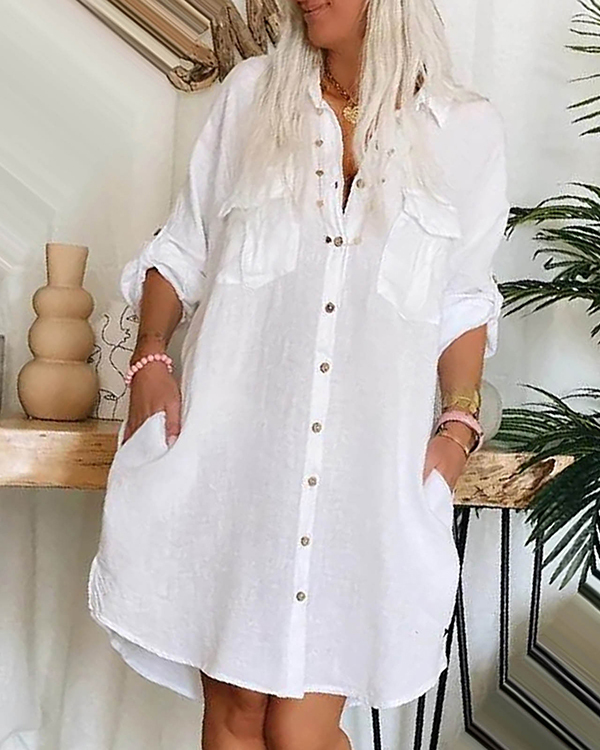 Women's Cotton Linen Solid Long-sleeved Casual Shirt Dress