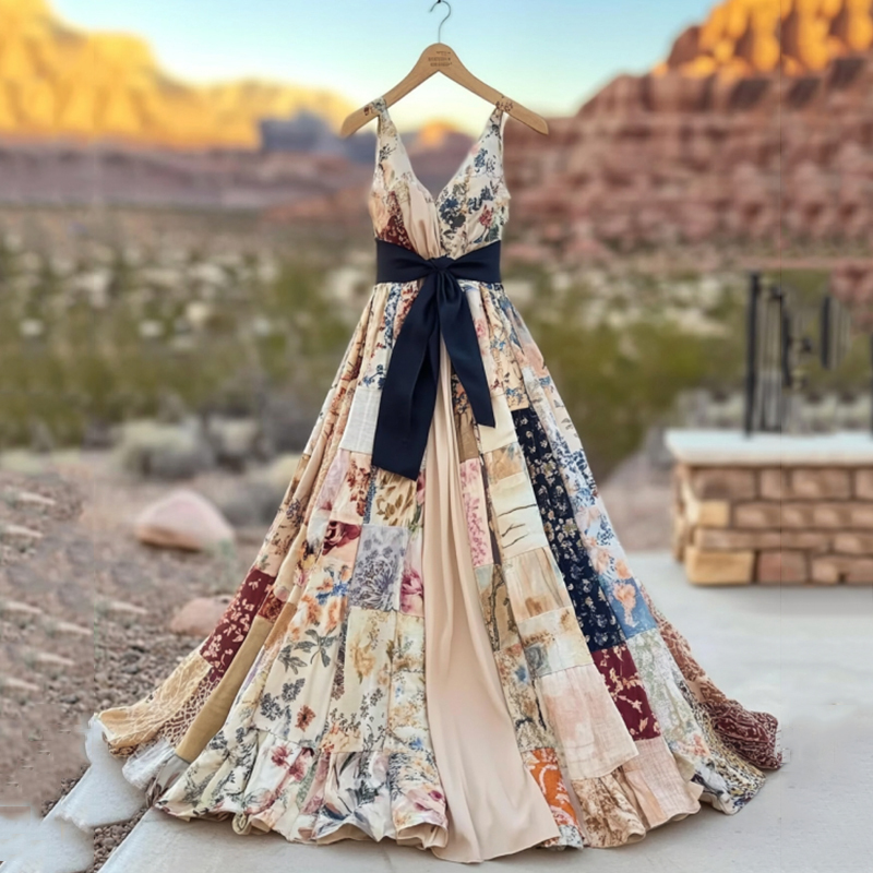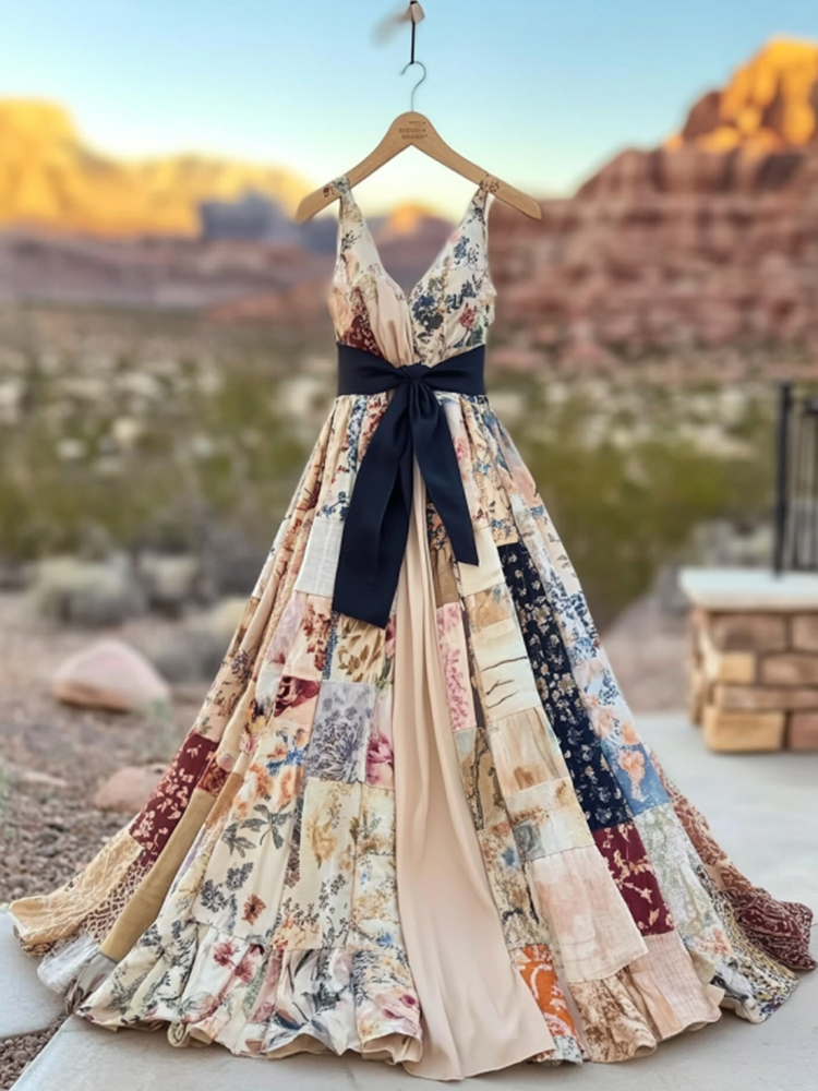 Women's Vintage Floral Patchwork Art Comfy Linen Dress