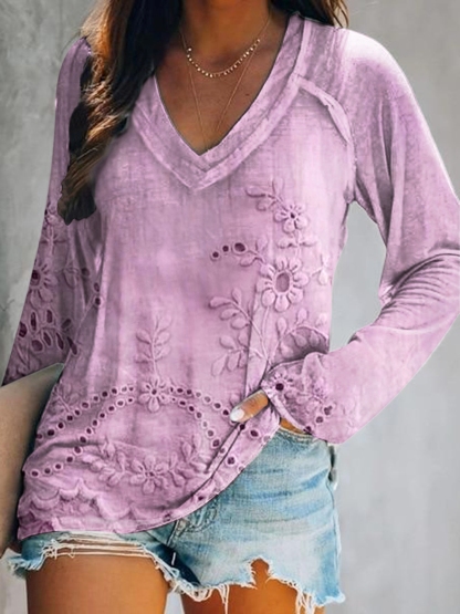 Women's Vintage Floral Texture Art Print V Neck Long Sleeve Tops