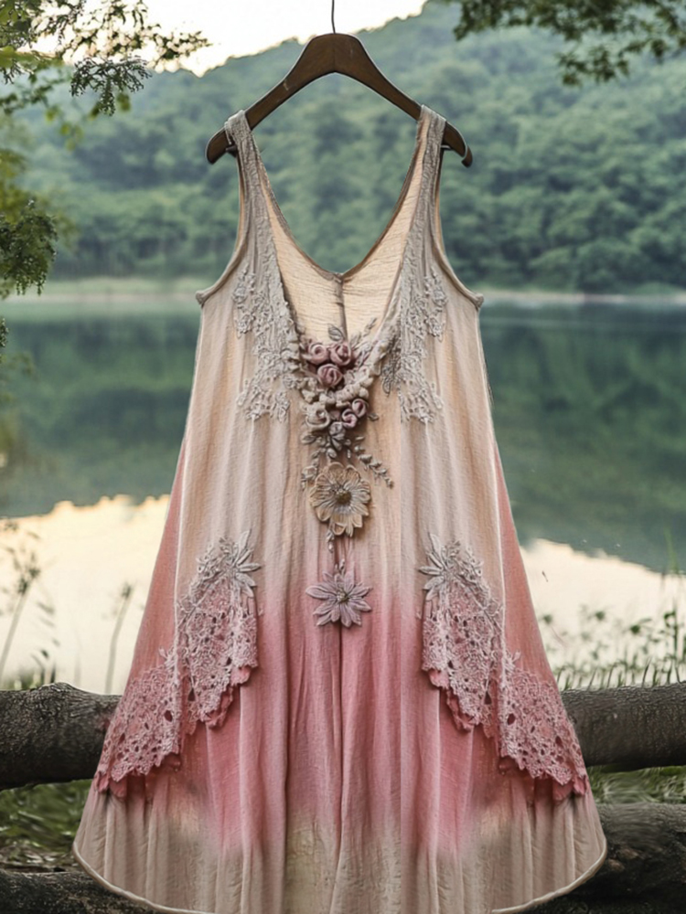Bohemian Lace Japan Sakura Embroidery Cozy Linen Tank Dress