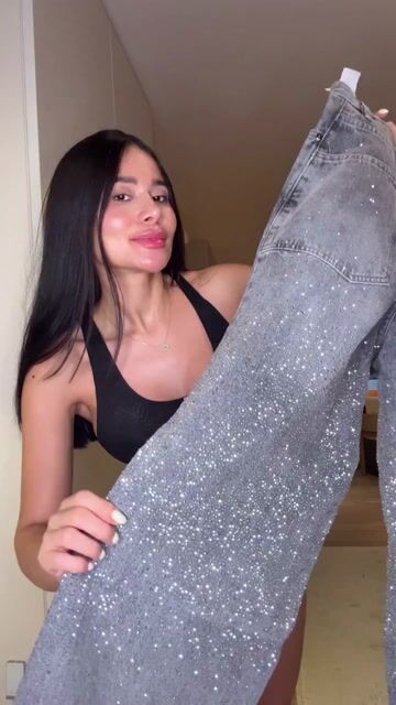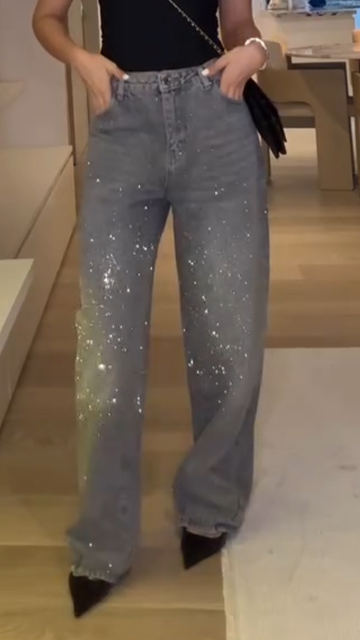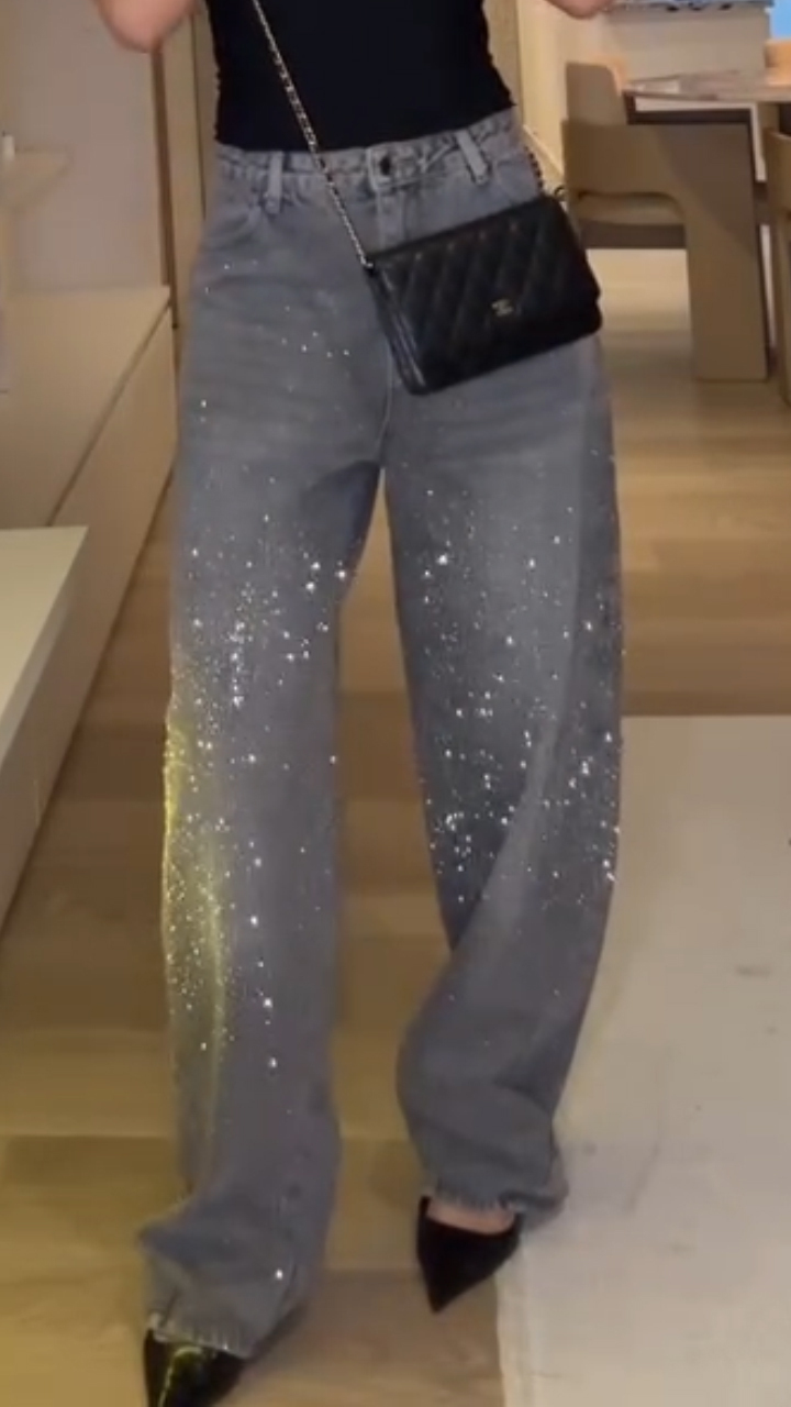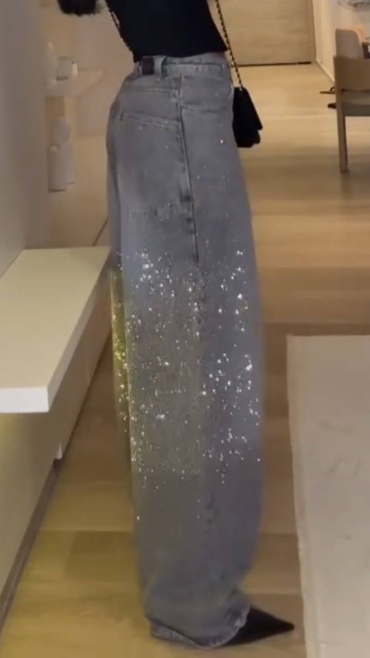 Your favorite wide-leg jeans now have a subtle shine. These jeans are designed to be loose-fitting and feature embellishments of heat-set rhinestones and sparkles, making them perfect as a statement piece. You can dress them up with high heels for a more formal look, or keep it casual with sneakers.