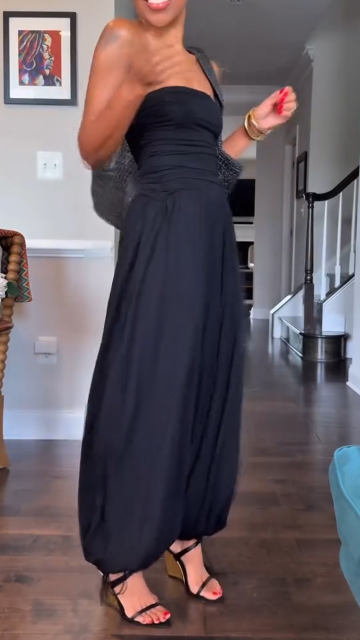This strapless light grey jumpsuit is more than just a piece of clothing; it’s a wardrobe essential. Dress it up with heels and statement jewelry for a formal event, or keep it casual with flats and a tote bag. No matter the occasion, it delivers a look that’s both polished and relaxed.