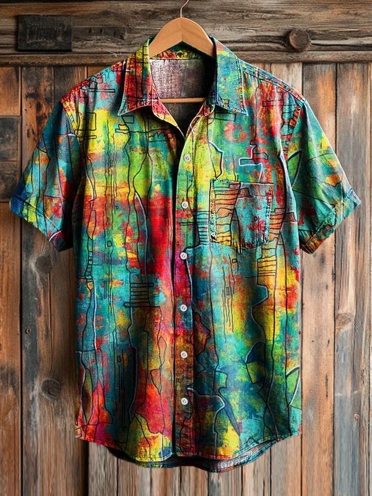 Men's Retro Swoosh Line Art Print Short Sleeve Pocket Shirt