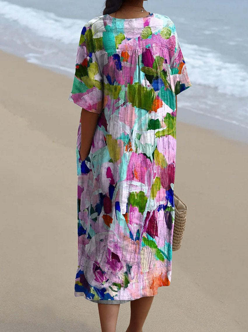 Oil Painting Abstract Floral Garden Printed Women's Flowy Dress