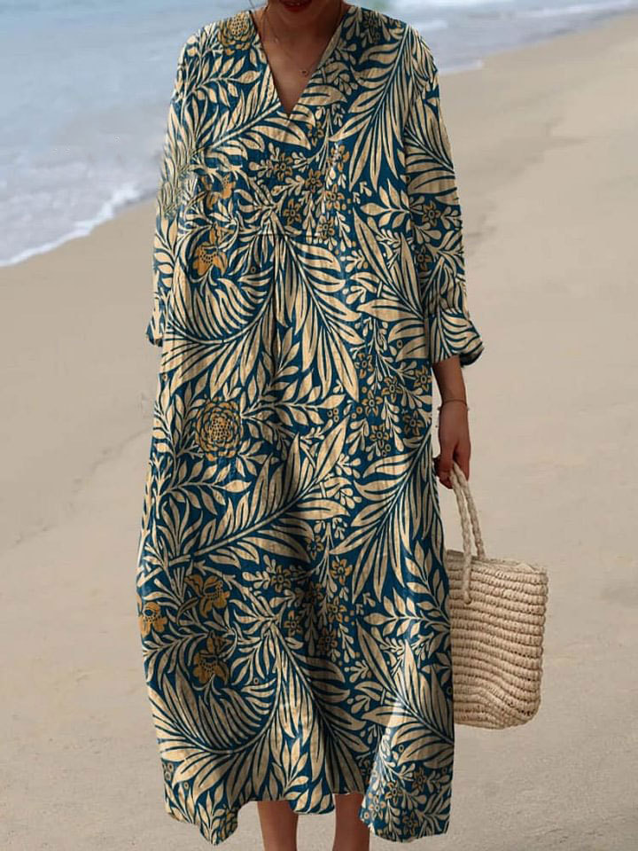 Retro Style Plant and Small Flower Decorative Pattern Flowy Dress
