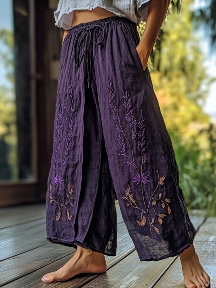 Vintage Bohemian Lavender Art Printed Cotton Linen Wide Leg Pants