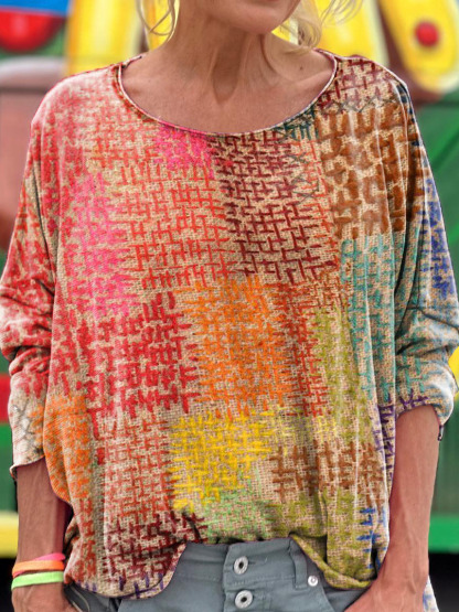 Women's Colorful Patchwork Texture Art Print Casual Long Sleeve Top