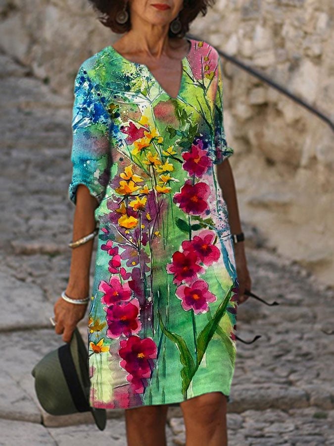 Women's Cotton Linen Oil Painting Floral Print V-neck Straight Dress
