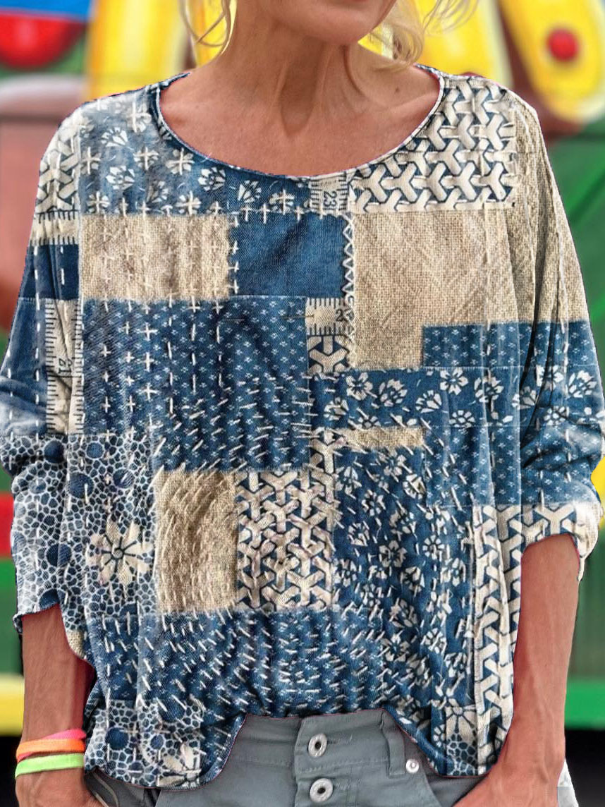 Women's Folk Floral Patchwork Texture Art Print Casual Long Sleeve Top