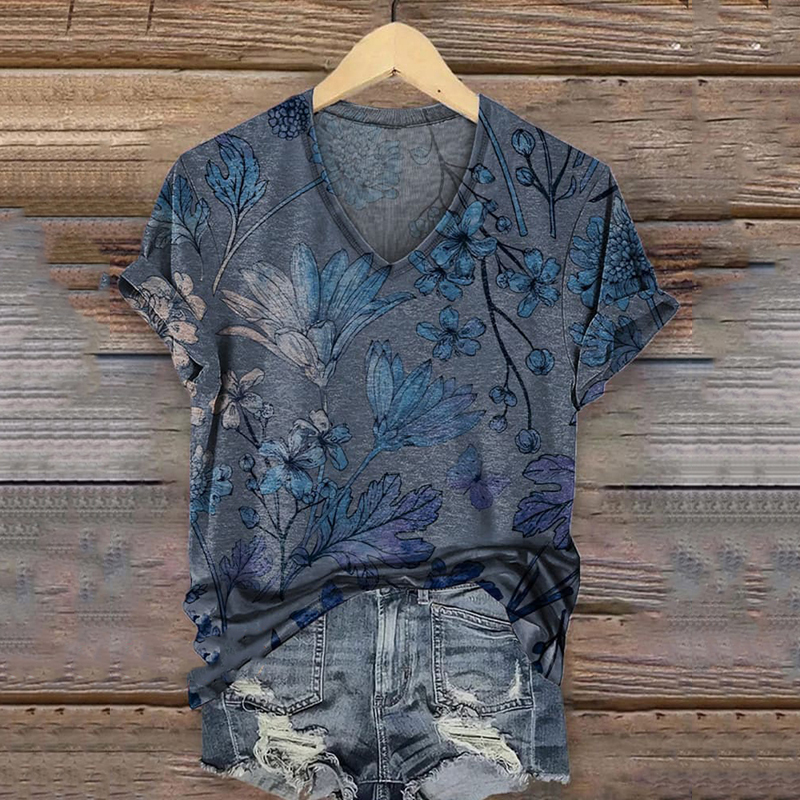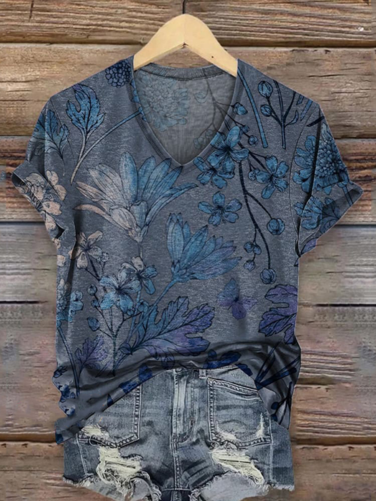 Women's Retro Floral Print Casual V-neck T-shirt